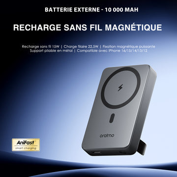 Restez chargé avec l’oraimo MagPower 15, un power bank 10000mAh avec charge sans fil 15W MagSafe et charge filaire 22,5W. Compact, avec support pliable et fixation magnétique puissante, il est idéal pour iPhone, AirPods et appareils Qi.
