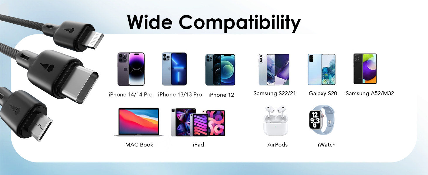 The included 1.2m 3-in-1 charging cable (Micro-USB, Type-C, Lightning) ensures universal compatibility with most devices, while the multi-protection safety system provides surge, temperature, and short-circuit protection for complete peace of mind.