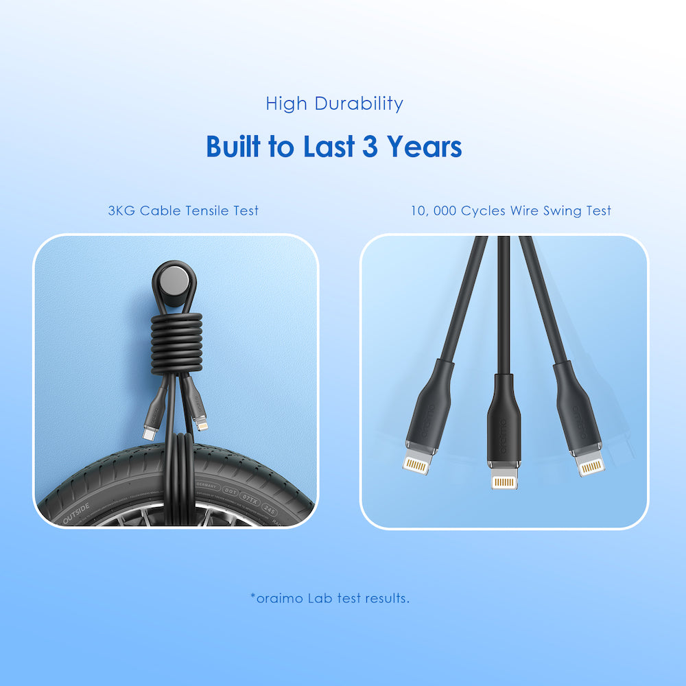 Supporting 20W fast charging (PD2.0/3.0) and delivering up to 5V/2.4A output, SilkLine ensures your iPhone or iPad charges quickly and safely. Engineered to last, it withstands up to 3KG tensile strength and 10,000 bending cycles, guaranteeing up to 3 years of reliable use.