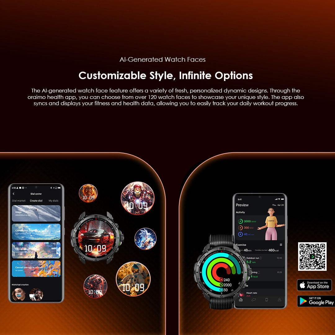 Stay on top of your health with heart rate and blood oxygen monitoring, and train smarter with 140+ sport modes tailored to your activities. The Watch GT also features AI-generated watch faces for unlimited personalization and integrates oraimo AI smart voice assistant for seamless control.