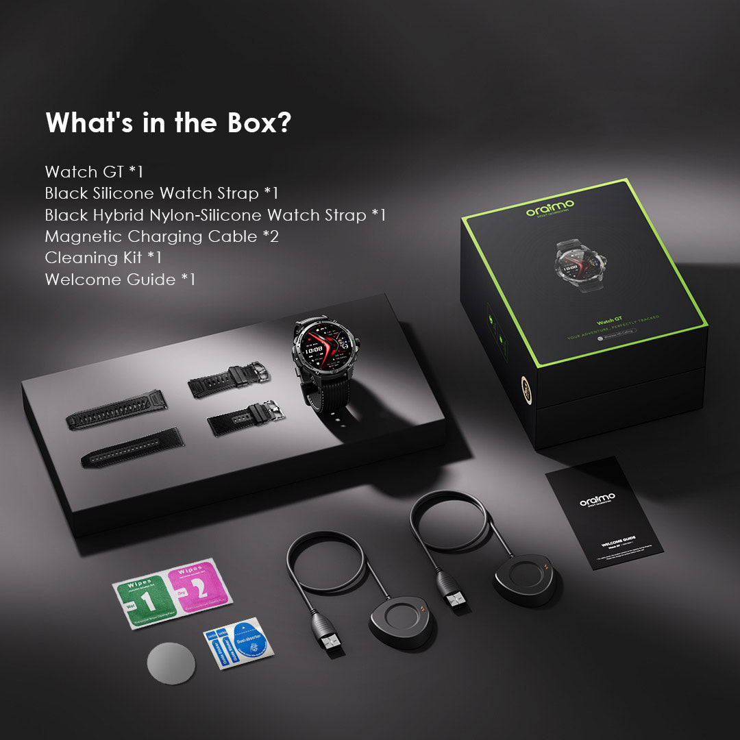 Packaged with two premium straps (black silicone and black hybrid nylon-silicone), two magnetic charging cables, and a cleaning kit, the Watch GT delivers both durability and premium convenience.